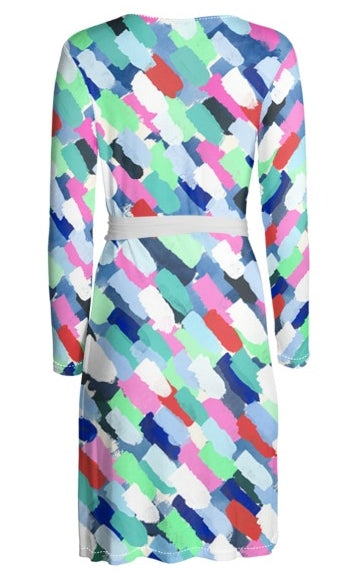 ひざ上丈のエレガントな長さのワンピースです。手首にかけて細くなっている長袖に、深いVネックスタイル。素材は伸縮性の良い細かい*ピケのあるソランジュ・シルキー・ジャージーです。