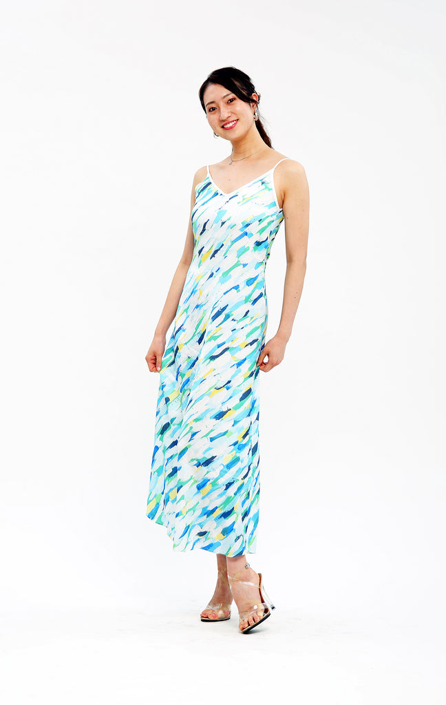 細い肩紐にVネックスタイルを持ち、背中部分は前よりもVカーブが3cm深くなるようにデザイン。フレア状の裾にすぼまったウエストラインが体のラインをきれいにみせてくれるフェミニンなシルエットで、着る人の体をセンシュアルに包んでくれるワンピースドレスです。細い肩紐で繊細な印象で三巻き仕上げで素敵な仕上がりです。イギリスロンドンにて作成されています。